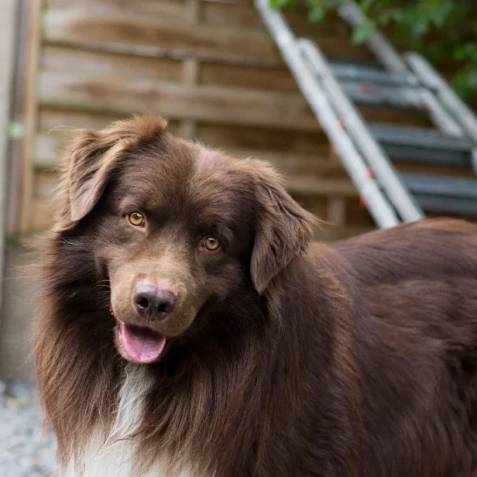 6 ROBE Qualité du poil : De texture et de longueur moyennes, droit à ondulé, résistant aux intempéries. Le sous-poil varie en quantité avec les saisons. Le poil est court et lisse sur la tête, les oreilles, le devant des membres antérieurs et sous les jarrets. L’arrière des membres antérieurs et les culottes sont modérément fournies. Crinière et jabot modérés, plus marqués chez les mâles que chez les femelles. Couleur du poil : Bleu-merle, noir, rouge-merle, rouge, toutes ces couleurs avec ou sans taches blanches, avec ou sans marques feu (couleur cuivre), toutes couleurs étant à égalité. Le collier blanc ne s’étend pas au delà du garrot. Le blanc est admis au cou (soit partiellement, soit en formant un collier complet), au poitrail, aux membres, à la partie inférieure du museau, avec liste en tête, et peut s’étendre à partir du dessous jusqu’à 10 cm (4 pouces), en mesurant de l’horizontale passant par le coude. Le blanc sur la tête ne doit pas dominer et les yeux doivent être complètement entourés de zones colorées. Les merle ont pour caractéristique de foncer avec l’âge.